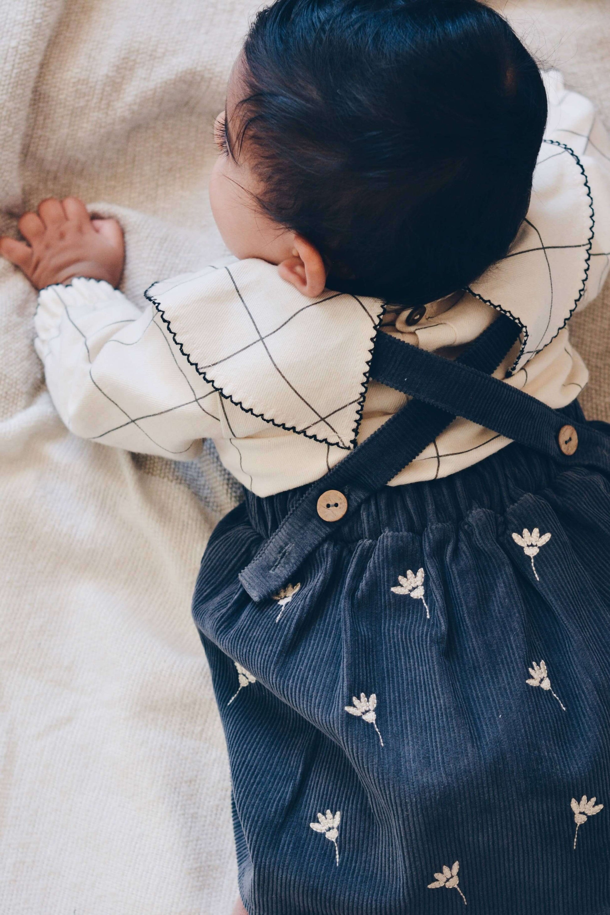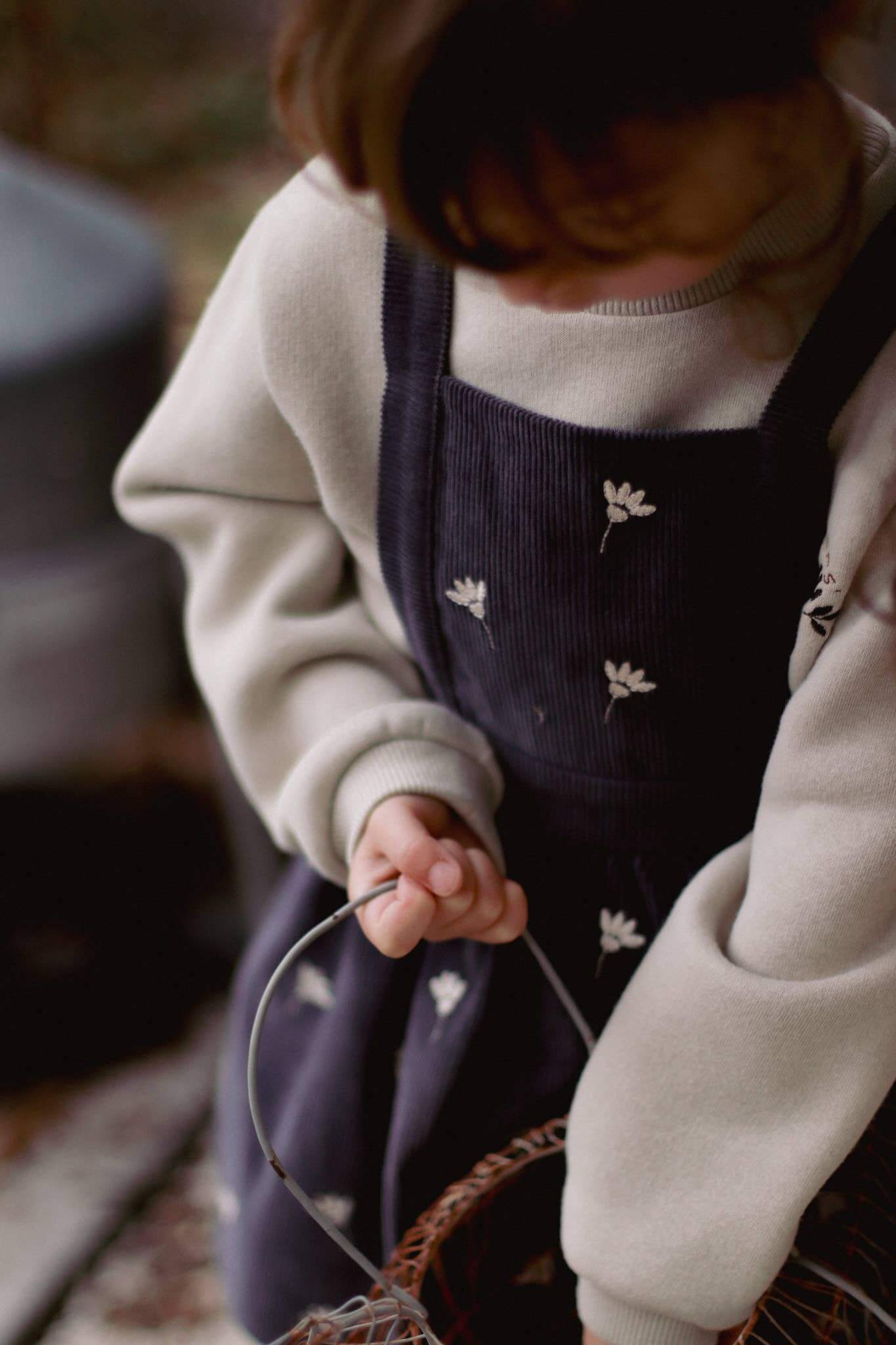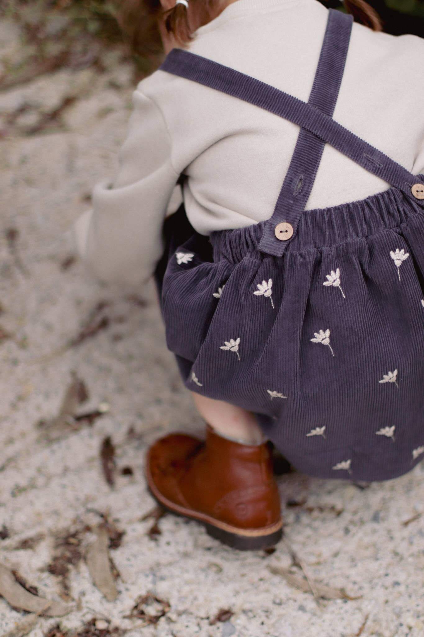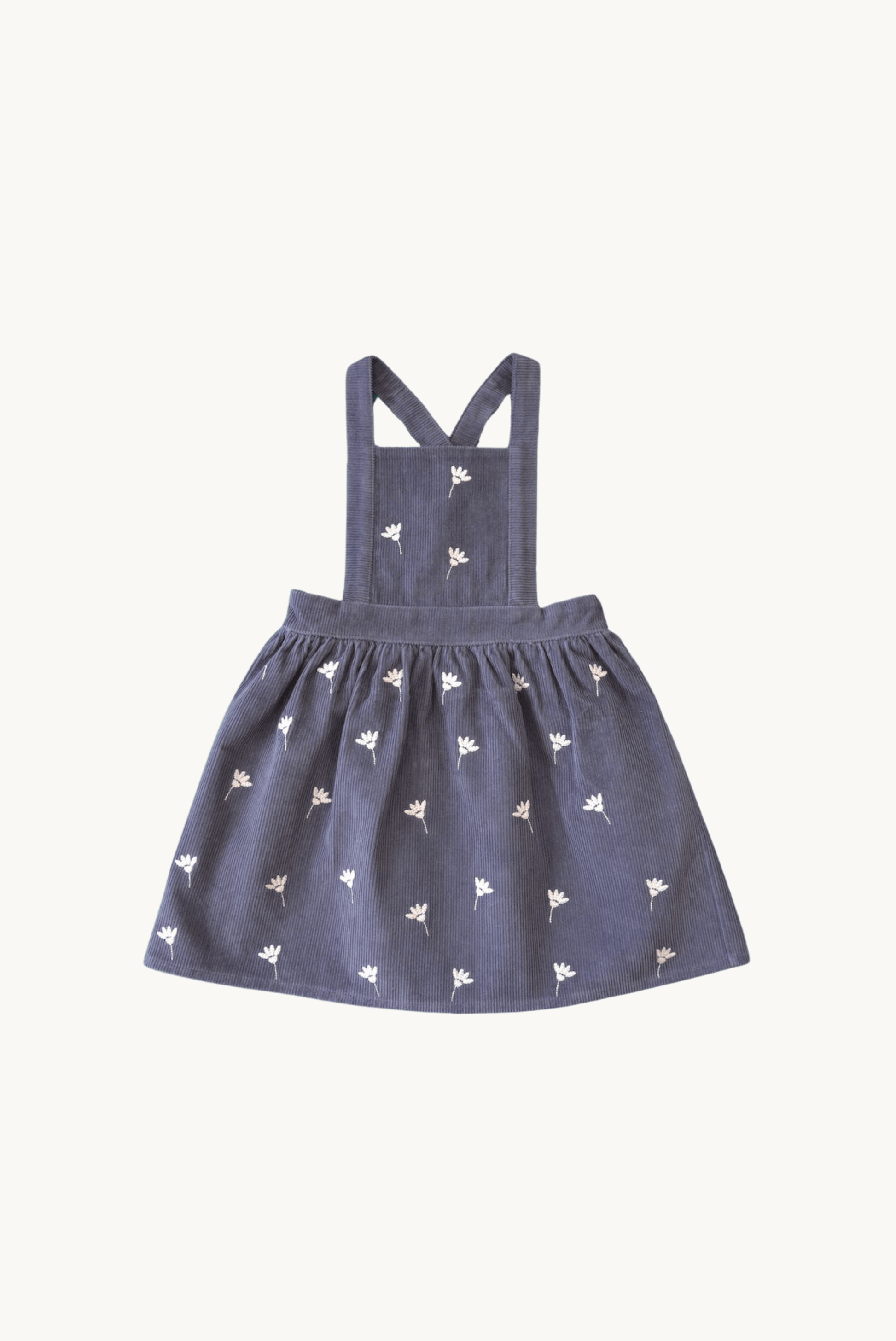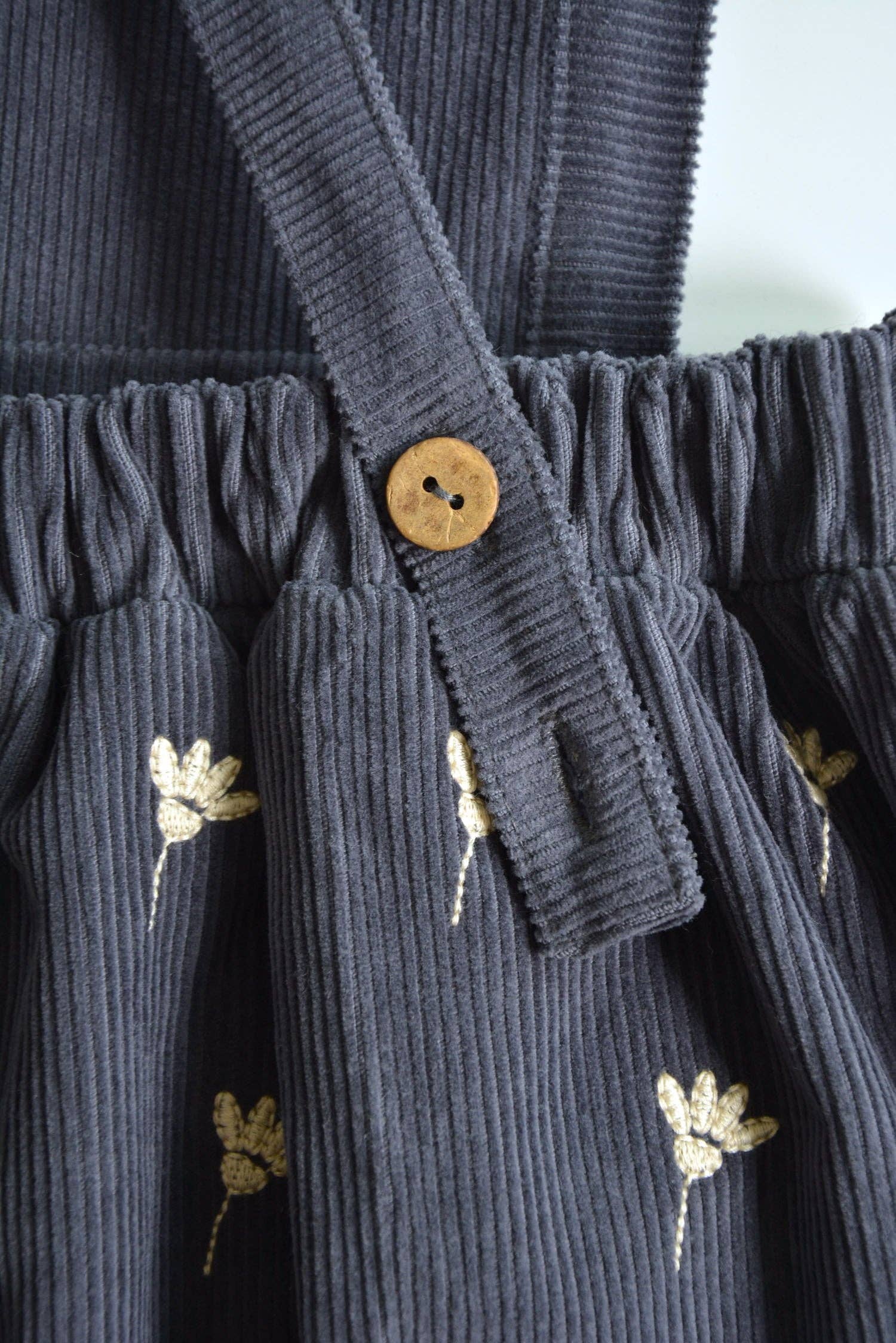 Gaia Dress – Stone Blue Corduroy, Floral Embroidery, Adjustable Straps, 100% Cotton OEKO-TEX