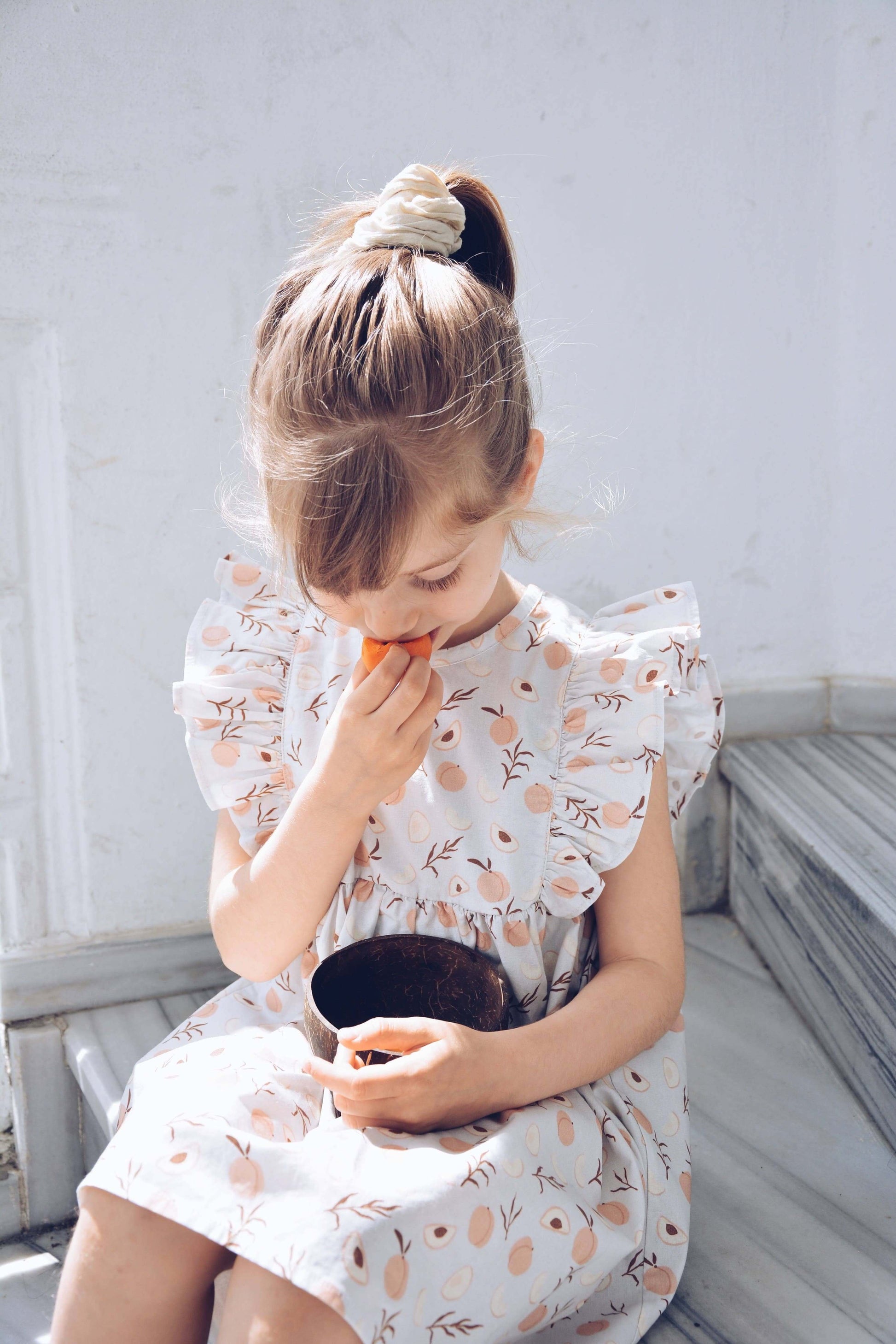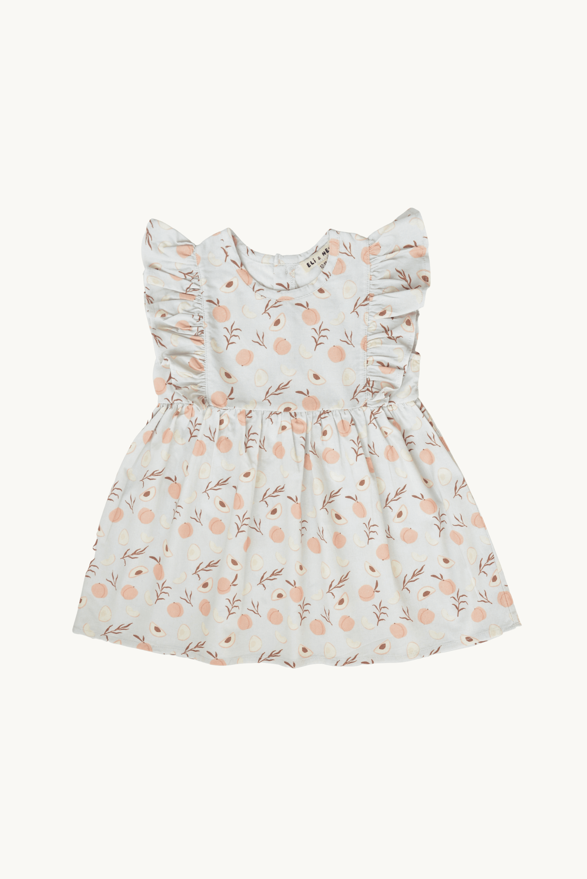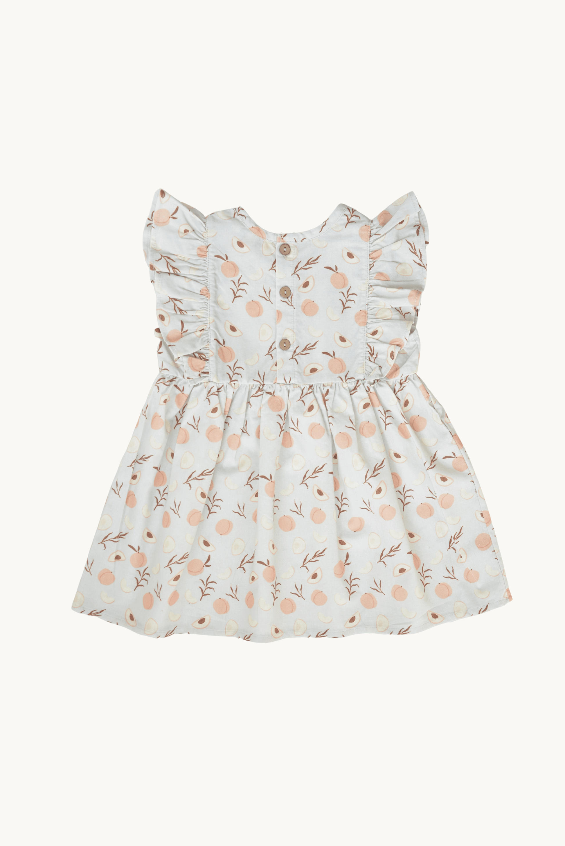 - Features a classic round neckline, playful ruffles on the sides, and coconut button closure at the back
