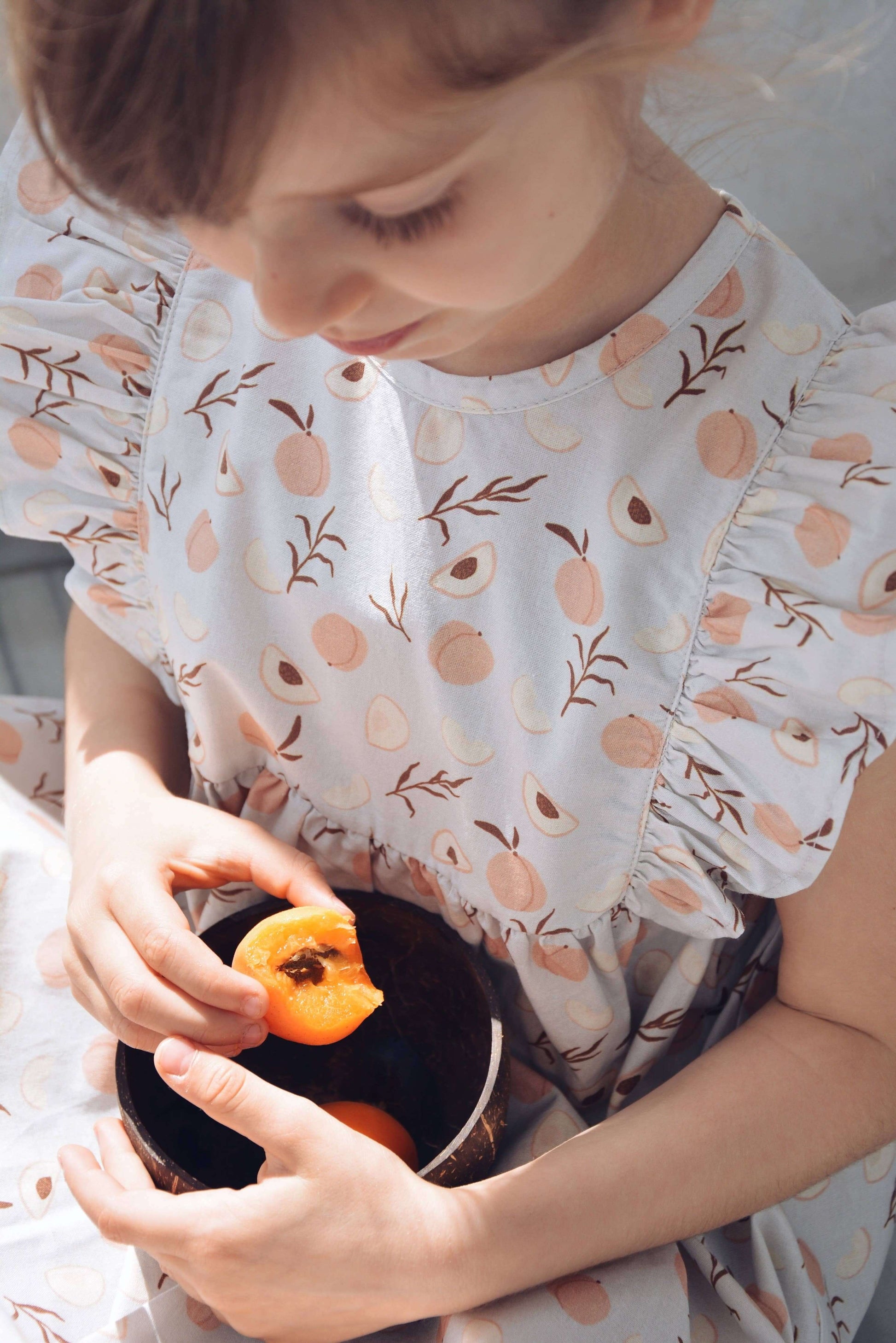 Blue with Peach Pattern, Ruffles & Coconut Buttons
