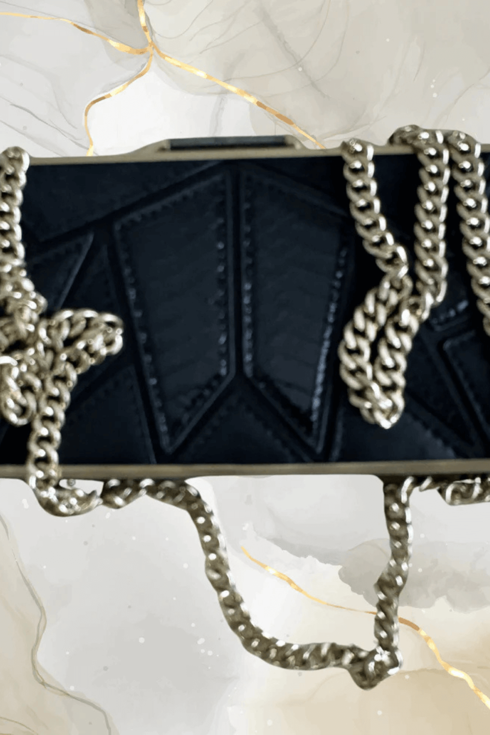 This striking Brian Atwood clutch features a bold geometric black leather design framed in brushed gold metal. Finished with a chunky gold-tone chain strap, this piece delivers statement style in a sleek, structured silhouette — perfect for cocktail hours, evening events, or an upscale fashion moment.