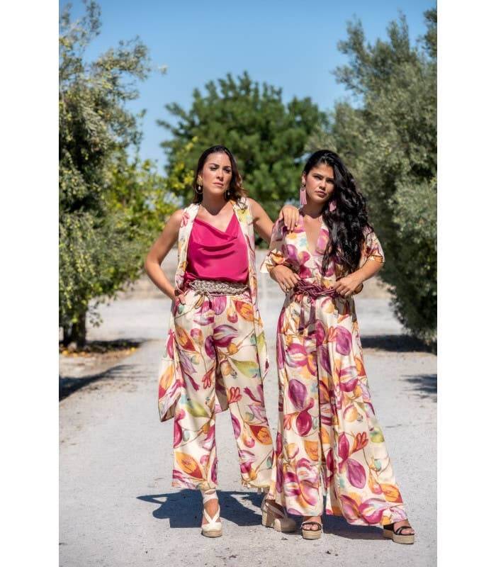 Soft, flowing, and effortlessly refined, these cream polysilk pants feature a delicate pink floral print with aqua-green motifs on a subtle beige background. The lightweight polisilk blend offers an elegant drape with a soft sheen, perfect for warm-weather styling or vacation-ready looks.