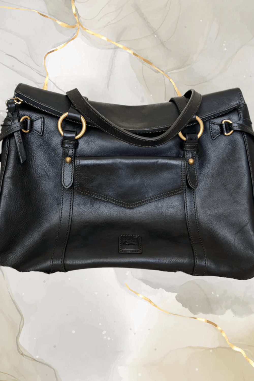 This authentic Dooney & Bourke leather satchel is crafted from rich, durable black leather and detailed with brass-tone hardware and tassel accents for a sophisticated finish. Designed with a roomy interior, structured silhouette, and comfortable rolled handles, this bag is both elegant and functional—perfect for everyday use or polished outings.