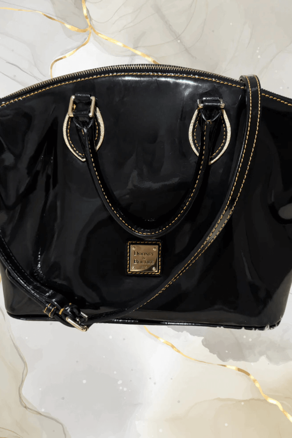 This authentic Dooney & Bourke satchel is crafted from glossy black patent leather and accented with gold-tone hardware and a signature tassel zipper pull for a luxe, high-gloss finish. The structured dome silhouette and contrast stitching create a polished, standout look that transitions effortlessly from day to night.